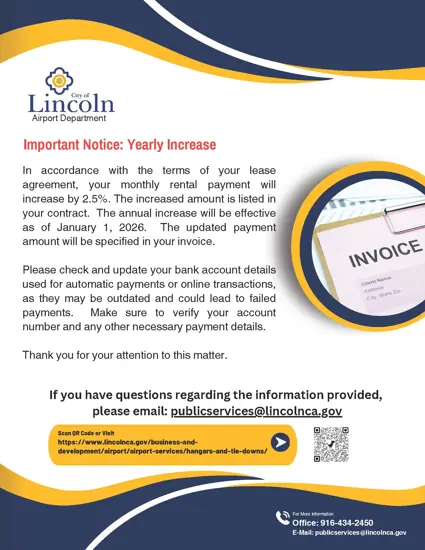 City of Lincoln aircraft hangars are rented as available. The hangars are rented on a leased basis for various terms.
