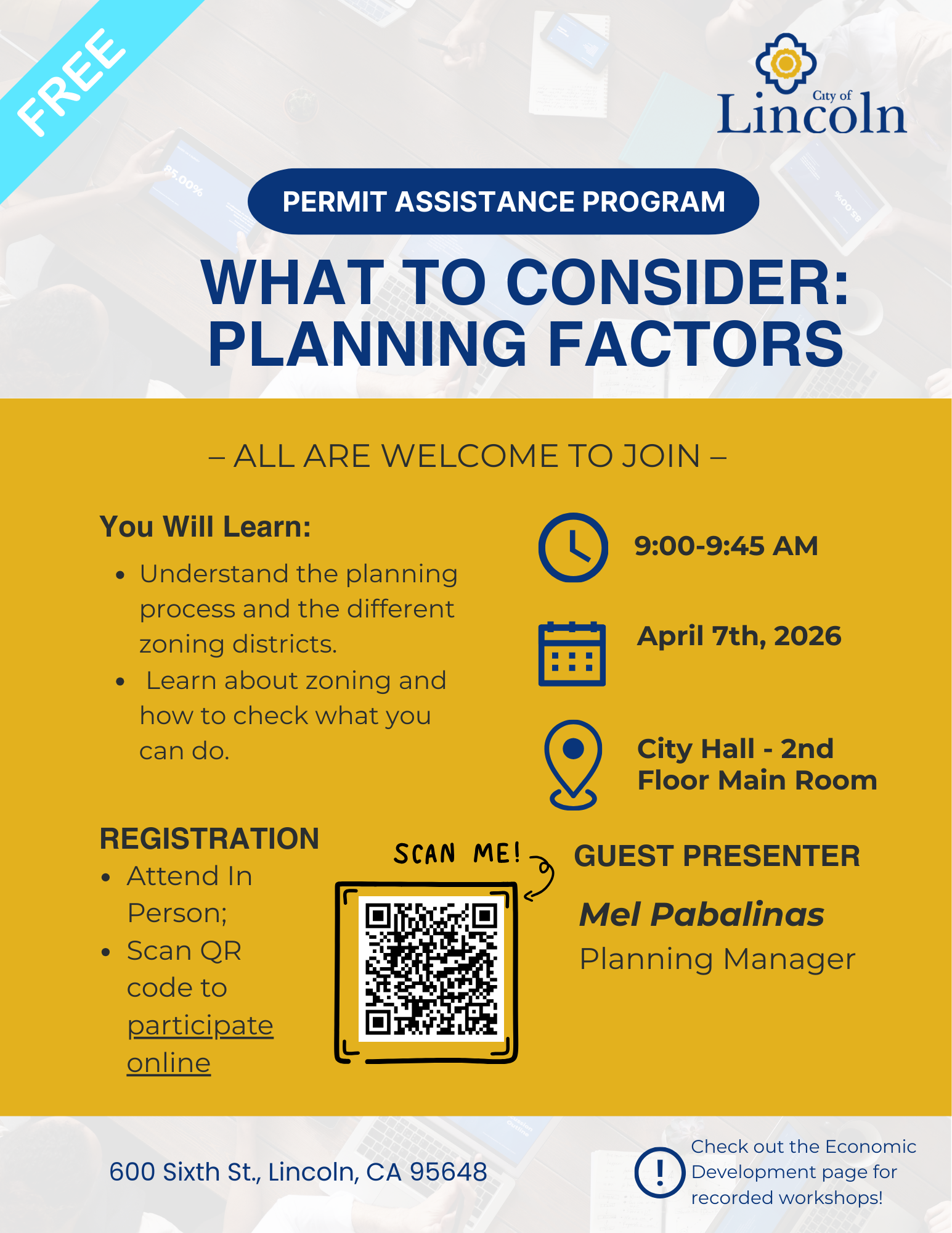 | Hybrid Workshop | April 7, 2026 | 9:00-9:45 AM | City Hall - 2nd Floor Main Room | What to Consider: Planning Factors | View Flyer | Recording: Coming Soon |