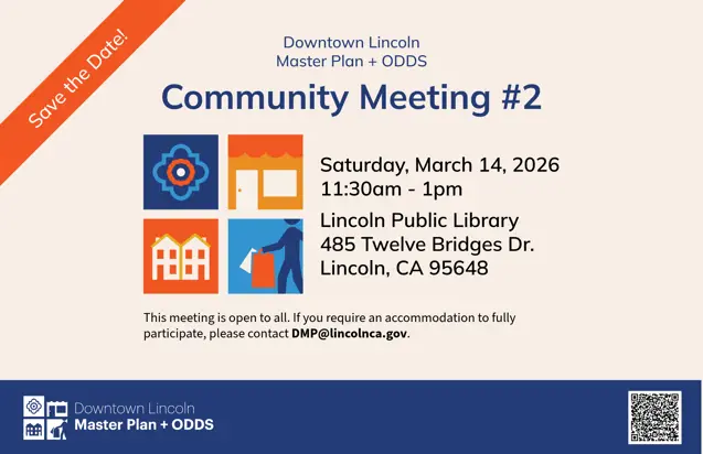 | Community Workshop #1 | November 13, 2024 | 6pm | City Hall - 1st Floor Conference Room, 600 Sixth Street, Lincoln CA 95648 |