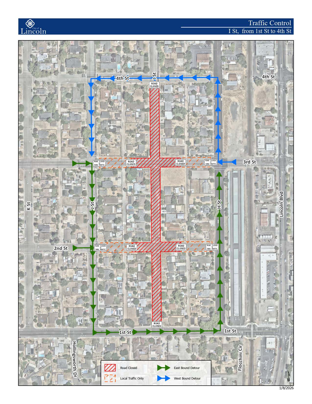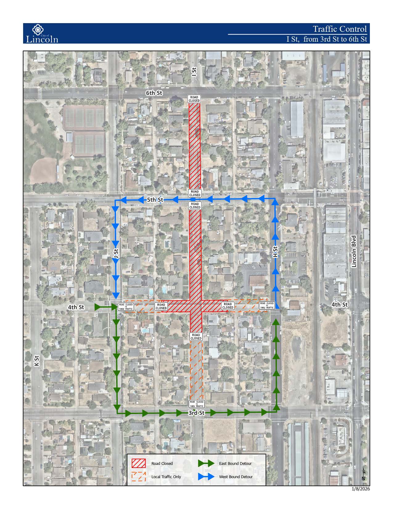 I St will be closed between 1st St – 6th St for paving work associated with the I Street Rehabilitation Project – CIP 601. Traffic control personnel will be onsite. Detour routes can be downloaded below: